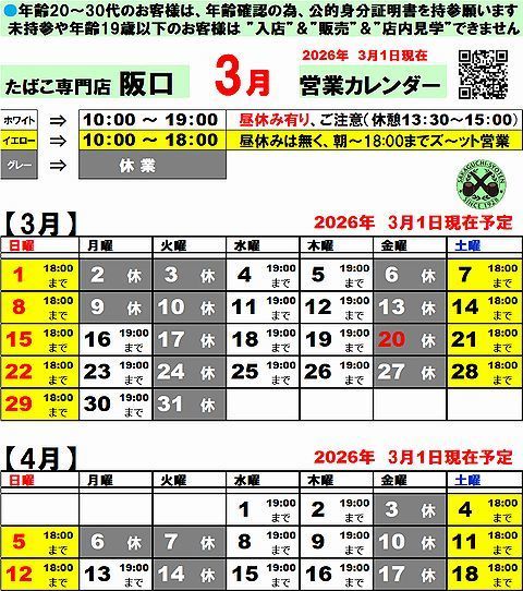 2022年4月1日、成人年齢に関する民法が改正されました。しかし、喫煙可能年齢は変わらず満20歳以上です。阪口商店でも、満20歳以上で、成人確認用の公的身分証明書を提示いただけるお客様にのみ、タバコ類の販売や説明をさせて頂く事には変わりありません。クレジットカード&電子マネーでのご購入時にも、当店はシッカリと成人確認をいたしますので、公的身分証明書をお忘れなき様にお願いいたします。 (2022年4月1日付)