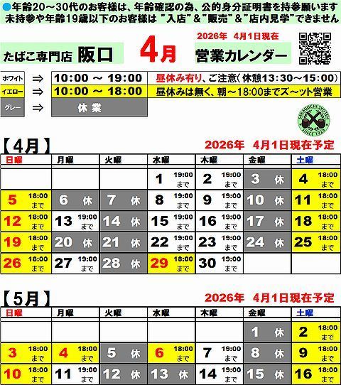 ●2022年4月1日、成人年齢に関する民法が改正されました。しかし、喫煙可能年齢は変わらず満20歳以上です。阪口商店でも以前と変わらず、満20歳以上で、成人確認用の公的身分証明書を提示いただけるお客様にのみ、タバコ類の販売や説明をさせて頂く事には変わりありません。クレジットカード&電子マネーでのご購入時にも、当店はシッカリと成人確認をいたしますので、公的身分証明書をお忘れなき様にお願いいたします。 (2022年4月1日付)